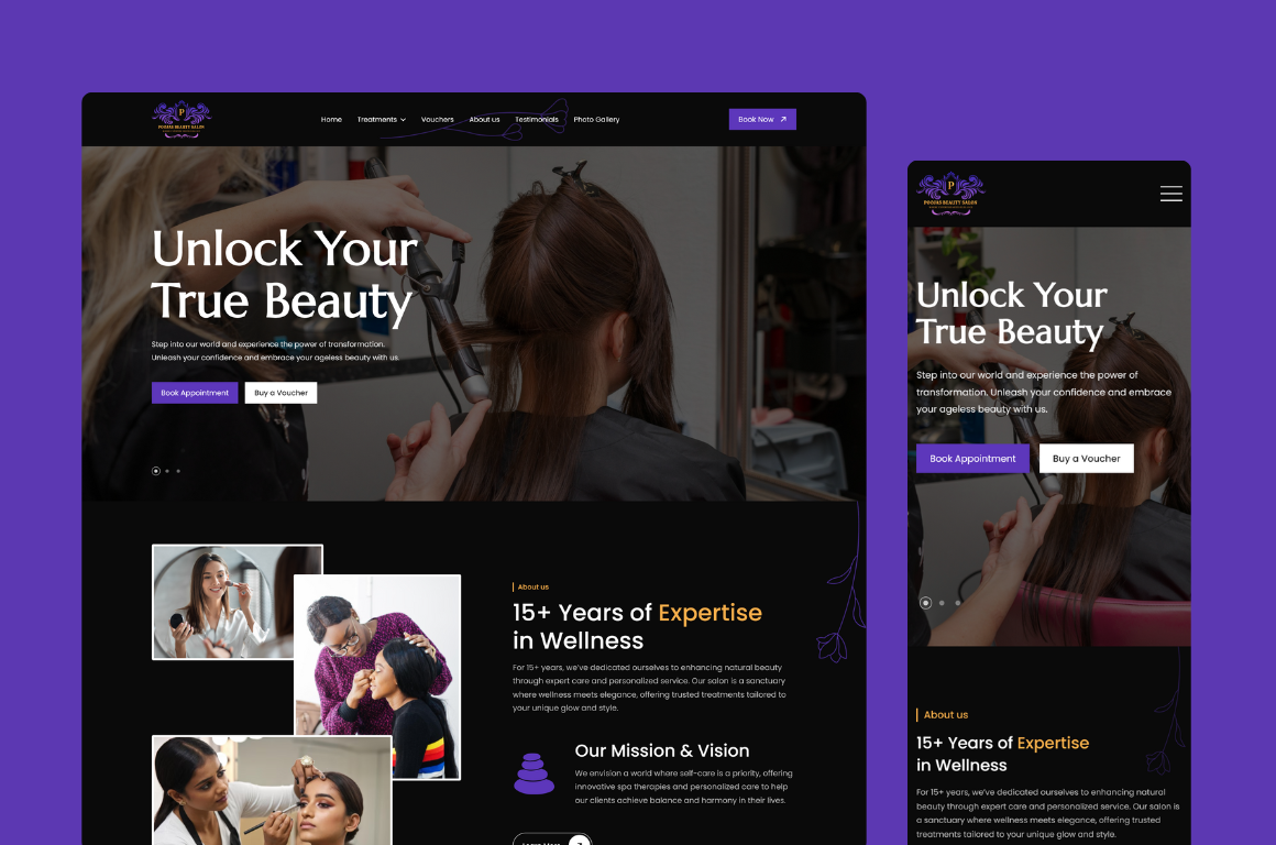A refined website designed to showcase beauty services, attract new clients, and highlight the salon’s unique touch through a smooth, elegant user experience.